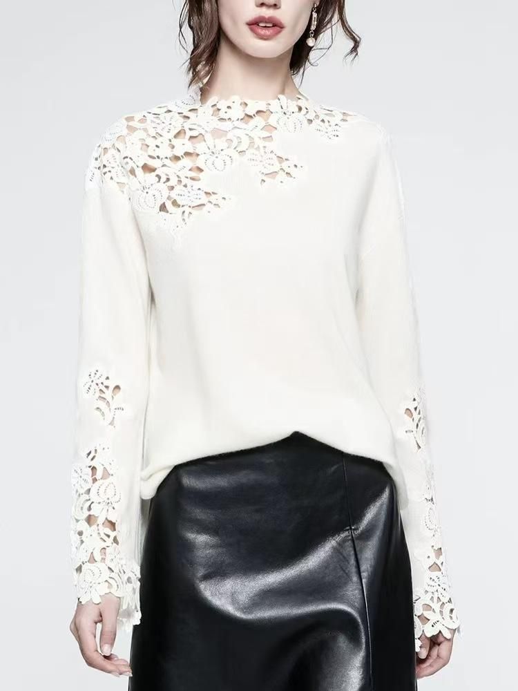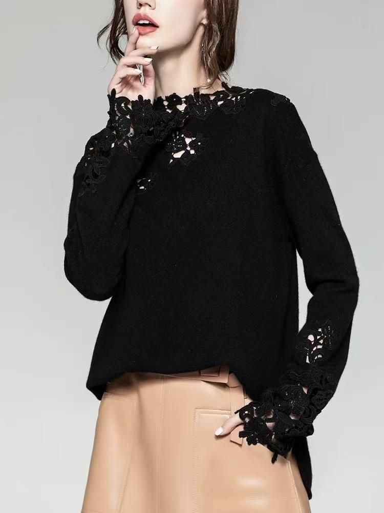 100%ウールに袖と肩にレースをミックスしたフェミニンニット